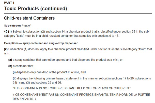 Consumer/Retail products intended for sale in Canada must meet not only the phrase requirements as per the existing CCCR 2001 but there may be additional requirements: CRCs (Child-resistant Containers). In Canada, there are specific requirements for when a CRC is mandated for consumer/retail non-registered products.